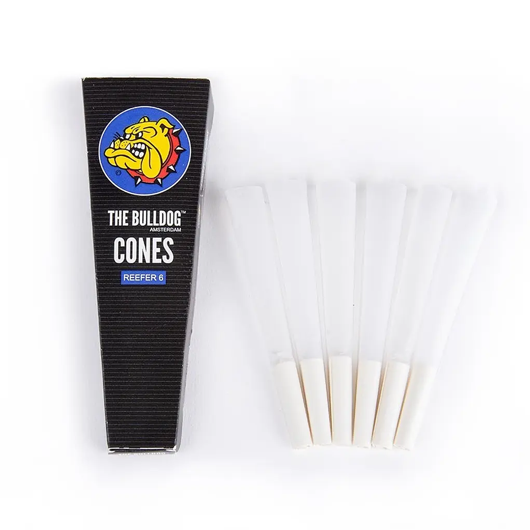 The Bulldog Conos Pre-enrolados 1 1/4. Cada paquete contiene 6 conos y está listo para ser llenado. Cada cono Reefer es de 80mm de papel de combustión lenta con un filtro de papel. Son fáciles de usar. Los conos son una buena alternativa a los papeles de liar porque siempre tendrás el rollo perfecto.